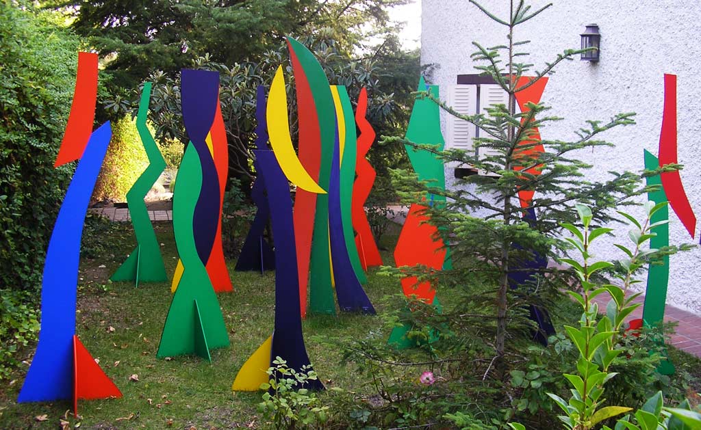 Cada una de las 3 esculturas de este grupo tiene en cada una de sus caras 2 PRIMARIOS, 2 SECUNDARIOS, 2 CONTIGUOS y 2 COMPLEMENTARIOS, por lo que están en un complejo equilibrio. Y en cada una de ellas los colores de una cara también están en la otra, son sus complementarios, aunque en otra posición.